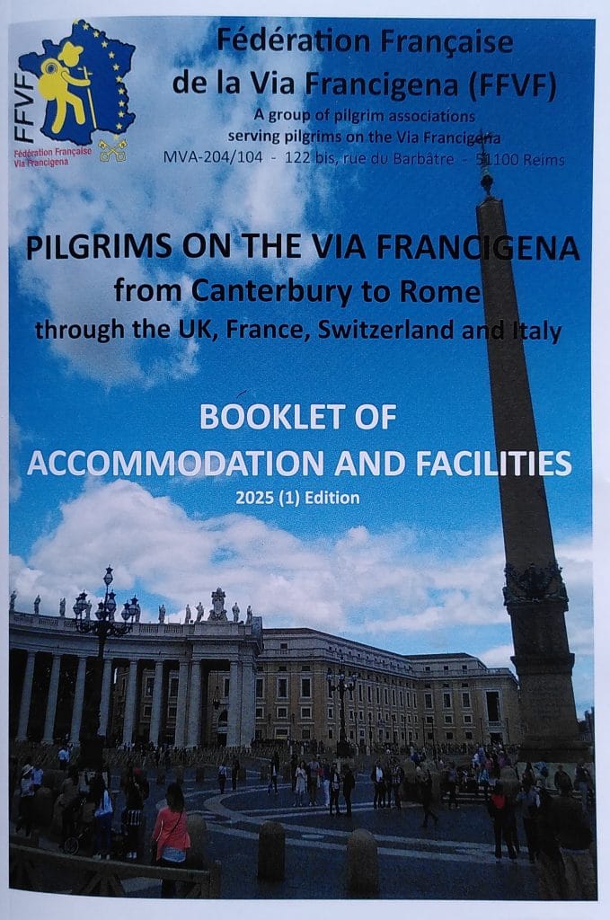 If you plan to walk through France, this slim booklet (weighing only 123g) is a vital companion. The booklet has accommodation listings for the entire length of the VF from Canterbury to Rome. It includes accommodation for every budget, cafés, restaurants, food shops (their days and times of opening), and details of every Mairie (town hall) and Tourist Office, as well as the kilometres between them.